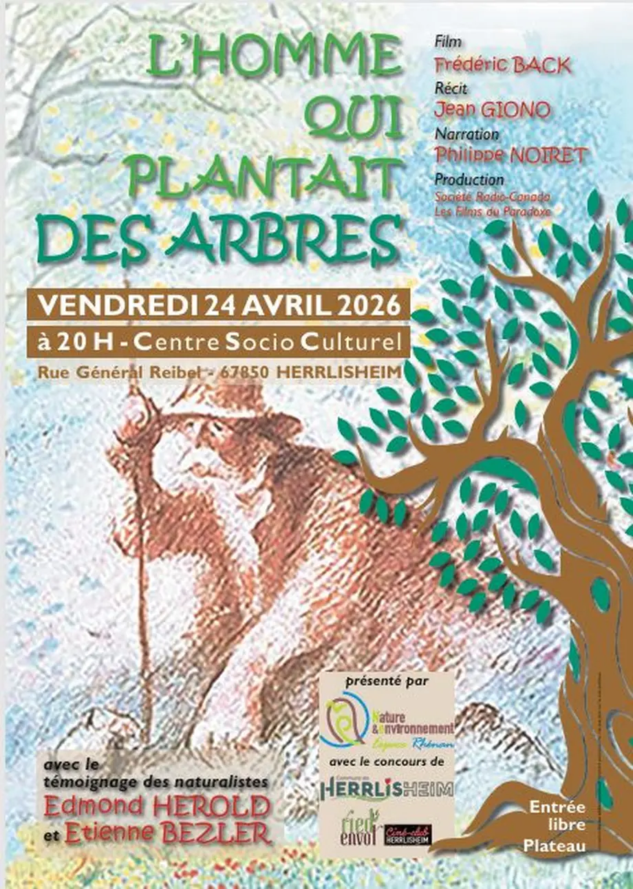 Vendredi 24 avril, à 20h au CSC de Herrlisheim, vous aurez le plaisir de voir le film d'animation " L'Homme qui plantait des arbres" du réalisateur Frédéric Back, d'après le livre de Jean Giono, suivi d'échanges passionnants avec les naturalistes Edmond Herold et Etienne Bezler.