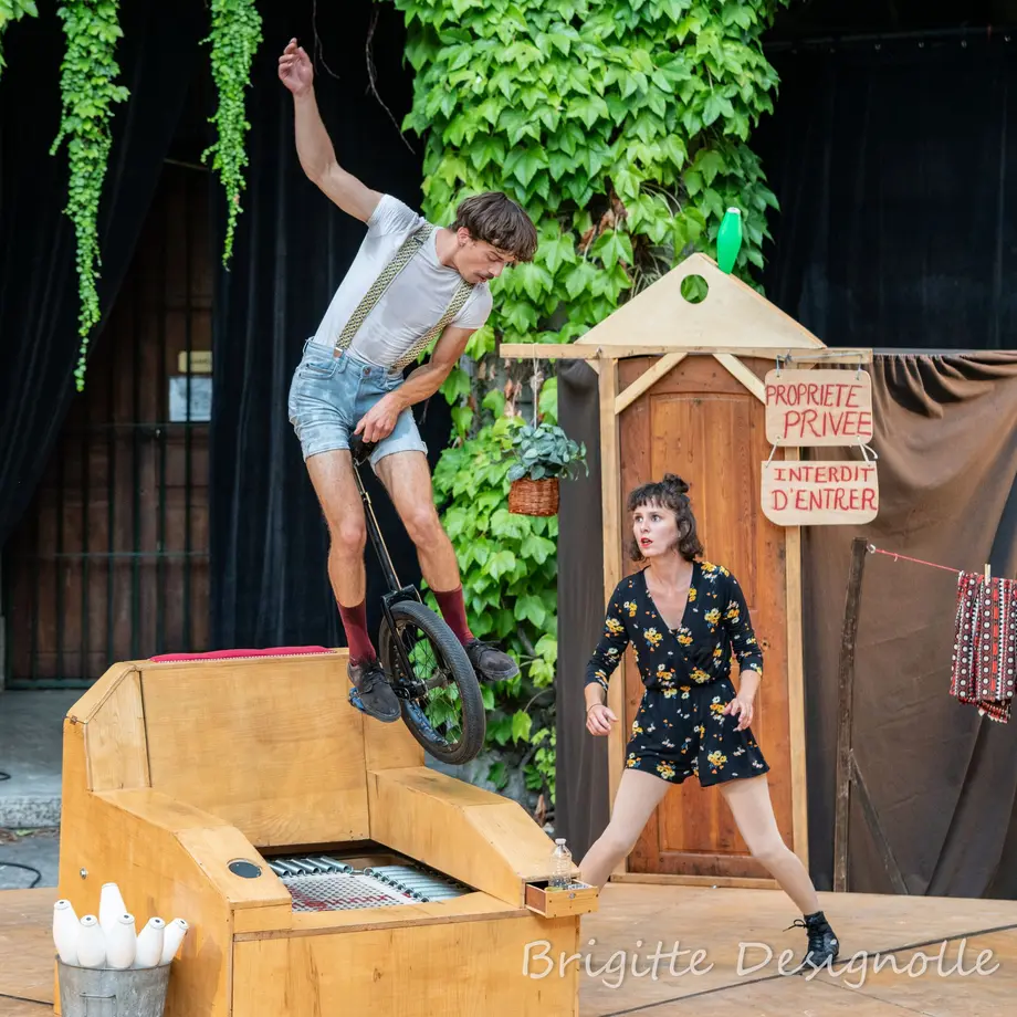 Personnalités et moyens d’expression différents, tout prête à l'incompréhension entre deux personnages. Alors si l’un empiète sur le territoire de l’autre, que se passe-t-il ? Pour donner tort à l'expression "chacun chez soi et les moutons seront bien gardés", Étranges Étrangers offre au public un moment de tolérance, d’optimisme et de légèreté. Monocycle, portés sur monocycle, main à main et jonglage invitent les deux personnages à se fréquenter la tête en bas et à partager la même roue.