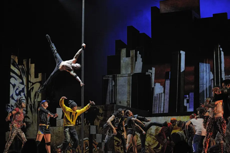 Sur scène, neuf artistes mêlent hip-hop et arts du cirque dans un battle rythmé et sans repère temporel. Guidé par Jeannot Painchaud, le spectacle enchaîne trail bike, roller, mât chinois, jonglage, trampoline et danse urbaine dans une chorégraphie précise et vive. La scénographie, entièrement repensée, s’appuie sur un univers numérique qui ancre le spectacle dans son époque.