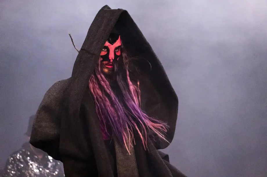 Sous une épaisse fumée blanche, une étrange créature apparaît. Son visage est dissimulé sous un masque de félin rose. Un imposant manteau de feutrine noire drape sa silhouette. De longs cheveux mauves flottent autour d’elle. Balayant la salle du regard, elle s’élance. Mi-homme, mi-animal, Volmir Cordeiro est traversé par les enjeux de la métropole et finit par la personnifier.