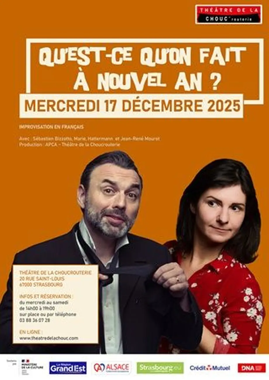 Ils sont trois sur scène mais plusieurs dans leurs têtes. Vont-ils s’entendre, se parler, se quitter ou juste chanter des chansons d’amour démodées sous les feux d’artifices ? Et puis au juste : qu’est-ce qu’on peut bien trouver à faire à Chouc’ville un soir de Nouvel An ? Sébastien Bizzotto et Marie Hattermann vous invitent à créer une histoire improvisée autour de Nouvel An, accompagnés de Jean-René Mourot au piano ! Préparez-vous à participer à une soirée unique.