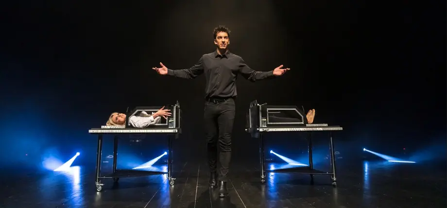 Dans cette création, il dépoussière la magie, en revisitant les classiques, notamment la célèbre femme coupée en deux, qu’il présente ici pour la première fois avec des boîtes transparentes.