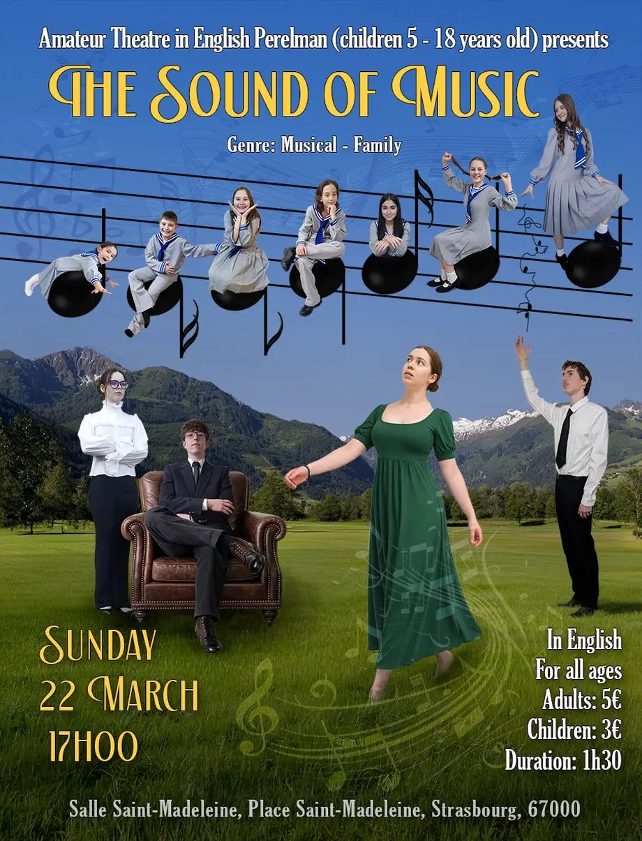 Le "Amateur Theatre in English Perelman" présente son spectacle, " The Sound of Music", réalisé par des enfants de 5 à 18 ans. Vous êtes invités à voir notre propre version d’une histoire ancienne, basée sur des événements réels. L’histoire est basée sur l’autobiographie de Maria von Trapp, les interviews des enfants von Trapp, le film Trapp Family, le film La Mélodie du bonheur (The Sound of Music), ainsi que sur nos propres suggestions et visions. Nos acteurs sont des enfants de 5 à 18 ans et le spectacle convient à tous les âges.