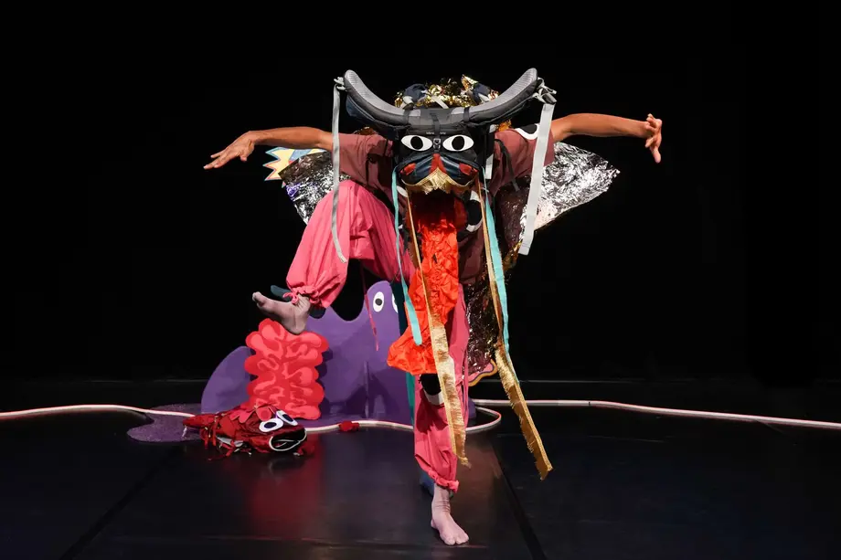 Ces deux êtres qui cherchent à s’apprivoiser sont incarnés par la comédienne et chanteuse Naëma Tounsi, et le danseur Marvin Clech. Elle est autant à l’aise avec Mozart qu’Ella Fitzgerald. Lui mélange le contemporain au krump. Iels mêlent ici leurs esthétiques et influences, et célèbrent la joie de devenir tout à la fois des animaux réels ou imaginaires, des dragons, des êtres hybrides. Iels utilisent le plaisir de la transformation magique pour donner vie à leur espace et aux objets qui les entourent à la façon d’un rite carnavalesque.