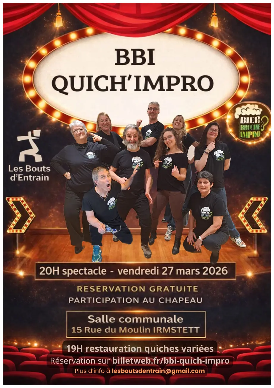 Spectacle gratuit d’improvisation présenté par la troupe amateur du Bier Bruche Impro (BBI) de Molsheim et organisé par l’association Les Bouts d’Entrain de Scharrachbergheim-Irmstett.