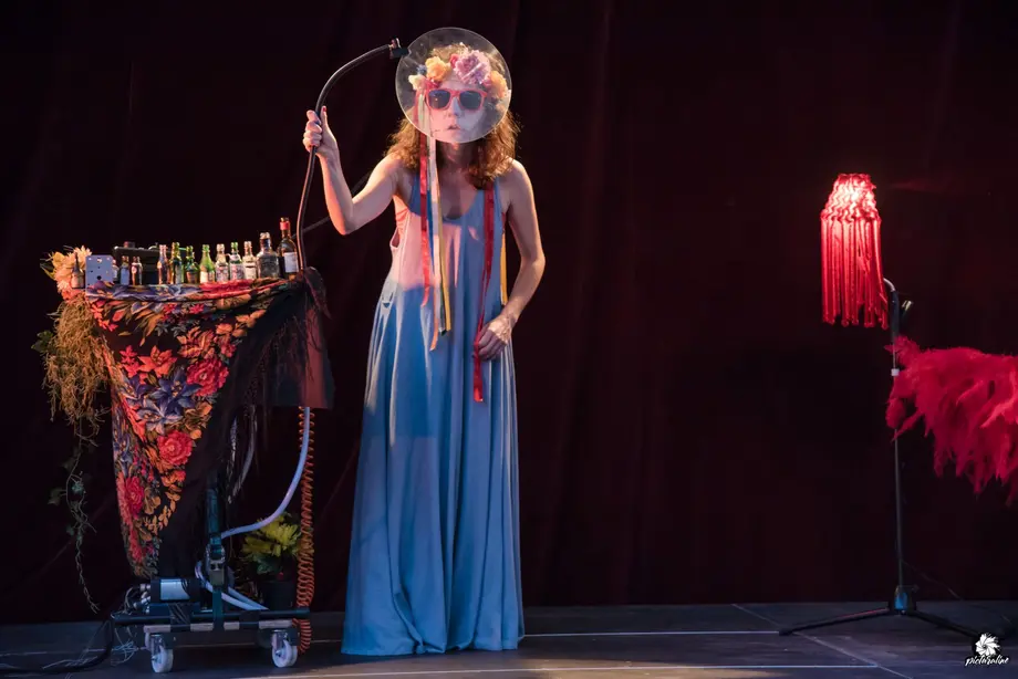 Vêtue d’une longue robe de nymphe et d’une couronne de rubans entremêlés, l’artiste donne le ton. Est-elle une créature antique, une farceuse ou une femme lyrique ? Elle est tout à la fois, traversant ces mondes avec humour et poésie.