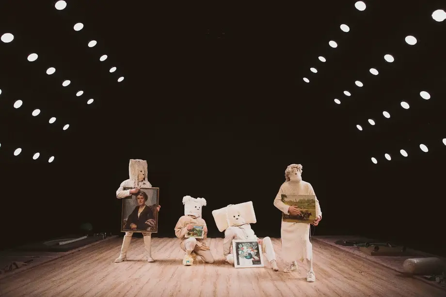 Guidé par son goût pour l’absurde et la poésie, le collectif Old Masters signe ici sa première création pour enfants. Cette pièce pleine de fantaisie allie théâtre, performance et arts visuels. Sur scène, quatre personnages, tout de beige vêtus, avec des têtes de peluches et des cheveux en laine créent des images à foison. Iels font sauter des billes aux quatre coins du plateau. Iels utilisent un ventilateur pour qu’une lampe en papier s’envole. Iels jouent les vacancier.es sous un parasol.
