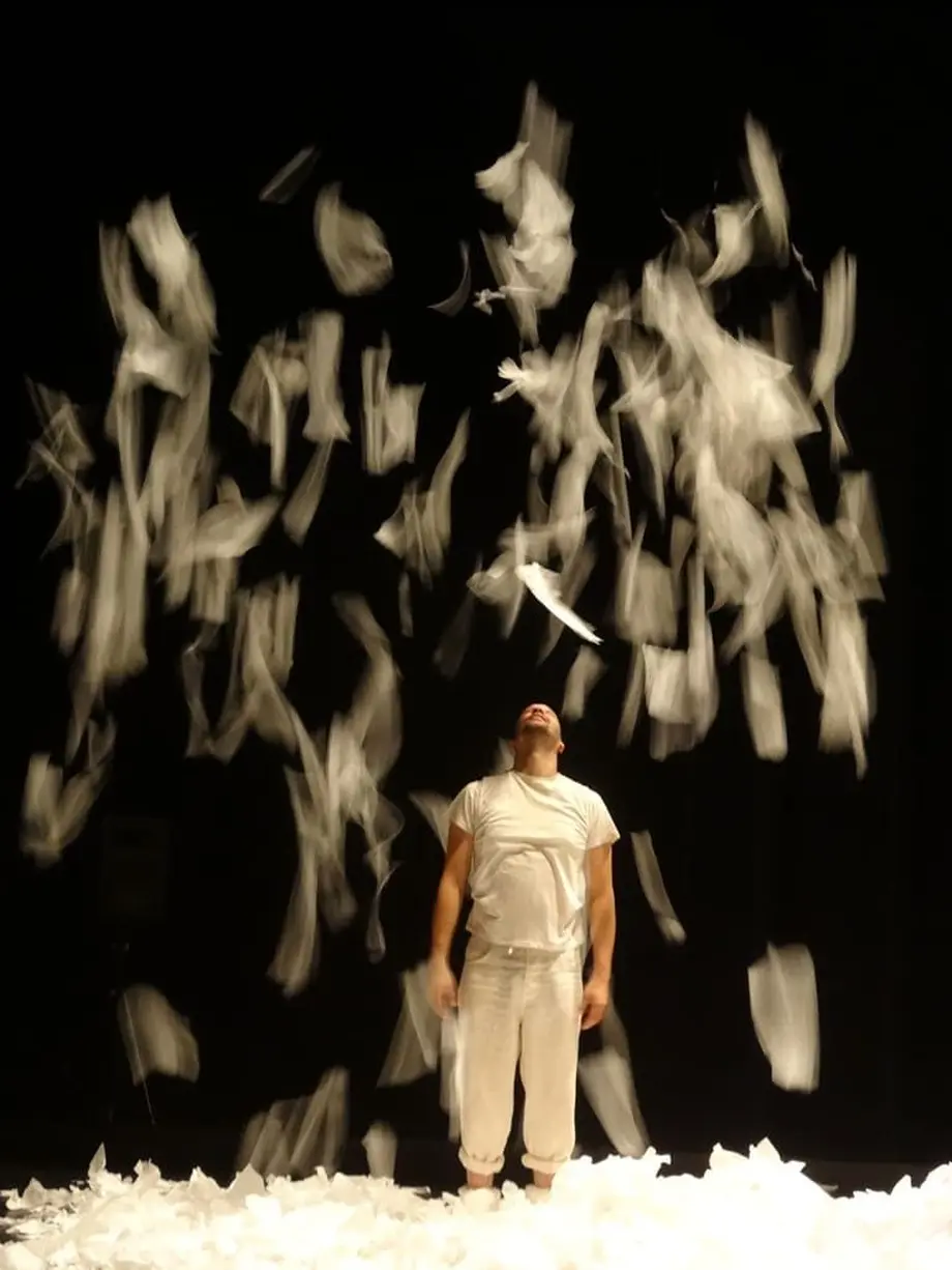 Dans ce spectacle pour toute la famille, une multitude de papiers de soie dessinent un paysage blanc, qui respire aux sons du vent, crisse telle la neige, et s’éclaire, et ondule. Les spectateurs, assis tout autour, guidés par la musique et la lumière, sont invités à un voyage sensoriel et poétique. Sous leurs yeux, à portée de main, deux comédiens éveillent en douceur ce qui sommeillait, et, sans paroles, ouvrent les portes des imaginaires.