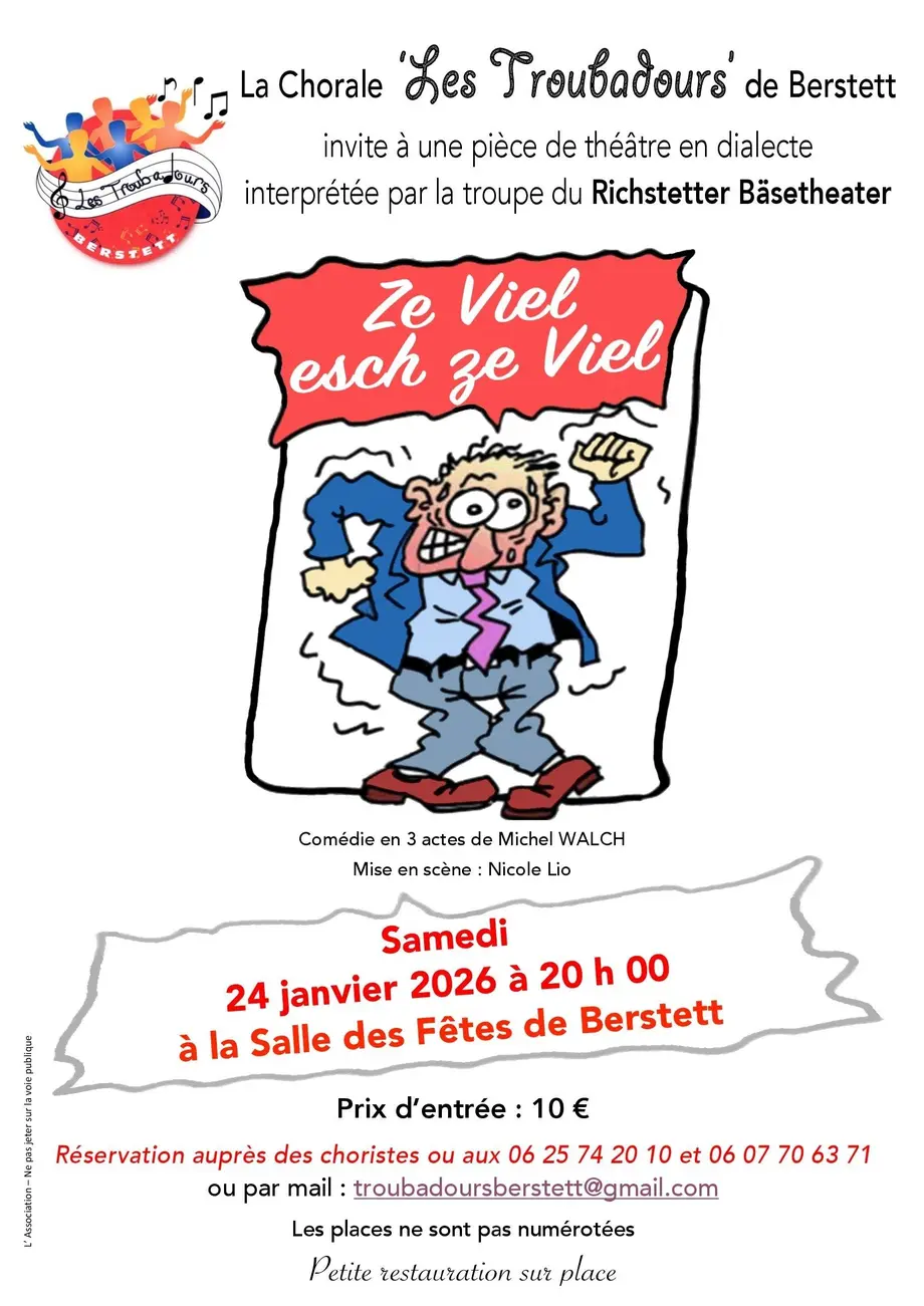La pièce « ze viel esch ze viei " , en 3 actes de Michel WALCH, du suspens et du rire garantis par des situations cocasses qui tiennent le public en haleine, en mettant en valeur la belle langue alsacienne