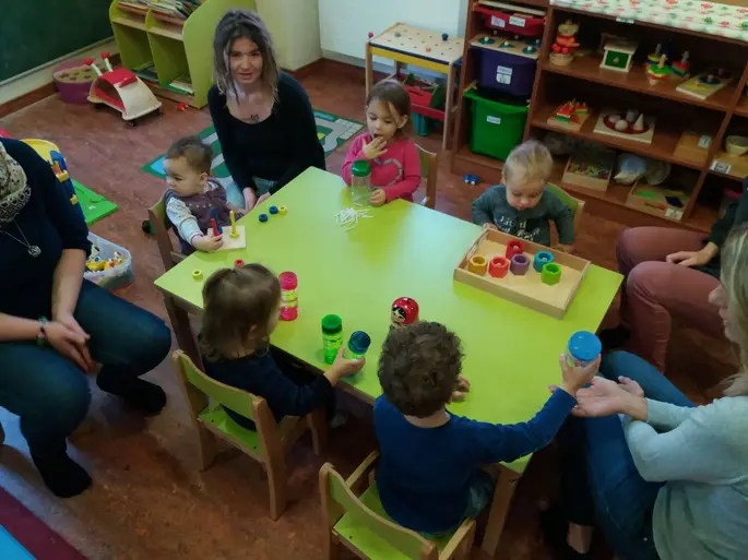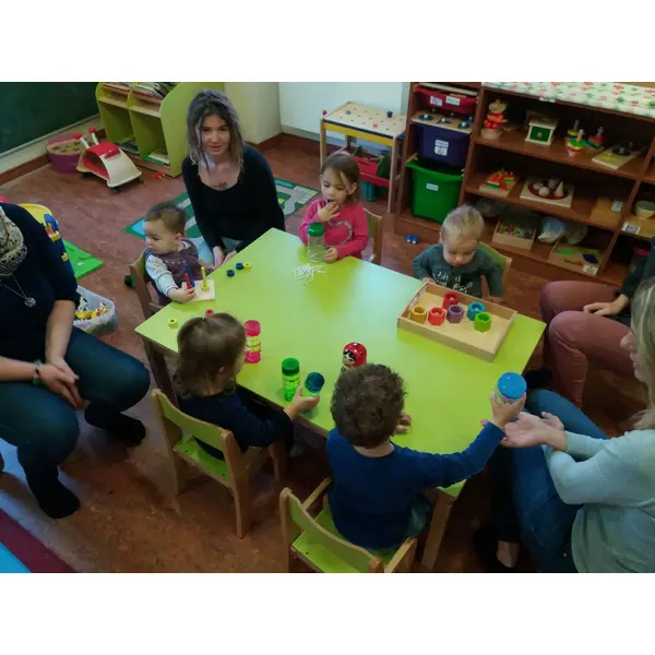 Une structure de motricité avec glissade dans la piscine à balle, des jeux, des plateaux d’atelier d’autonomie (type montessori), des activités manuelles adaptées, des comptines et rondes pour finir la séance.