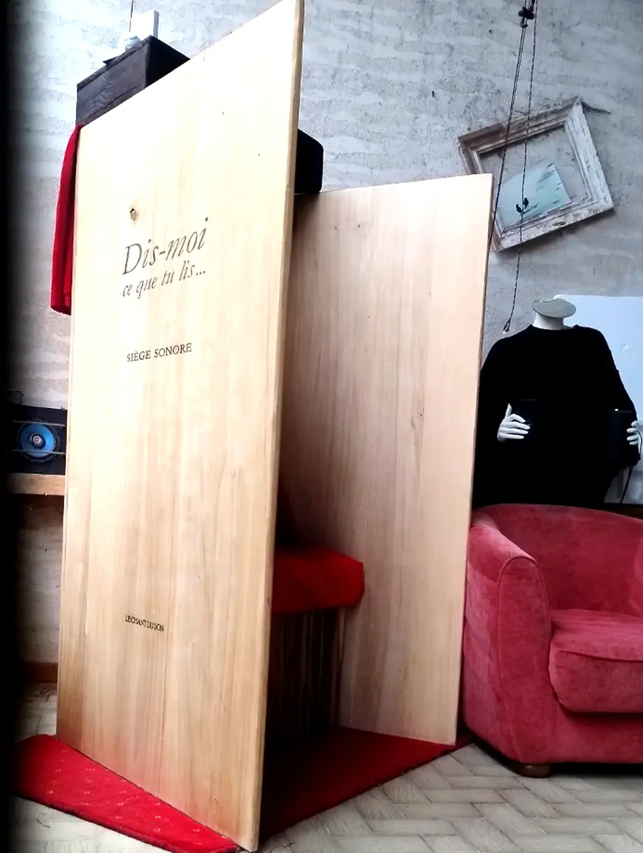 Le Livre sonore, par Patrice Caumont, de la compagnie Le Chant du Son, est une installation à la médiathèque qui offre une expérience sonore immersive : on s’y installe confortablement, sous une lumière douce, à l’intérieur d’un grand livre en bois.