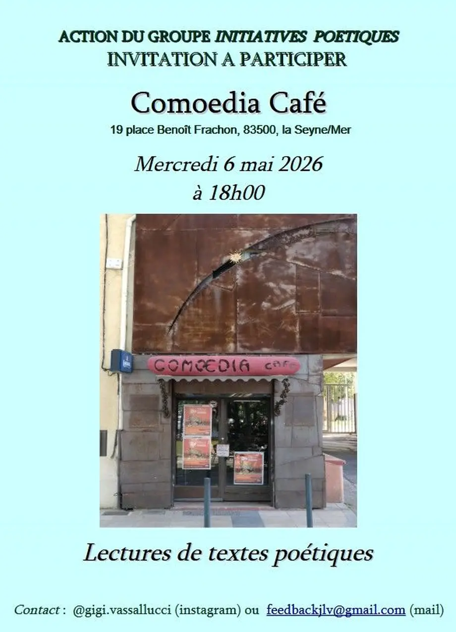 Le 6 mai 2026, à la Seyne sur Mer, nous ferons des lectures d'écrits poétiques... Chacun pourra venir avec l'un de ses textes. Bien entendu, tous ceux qui n'ont pas envie de lire sont aussi chaleureusement invités !