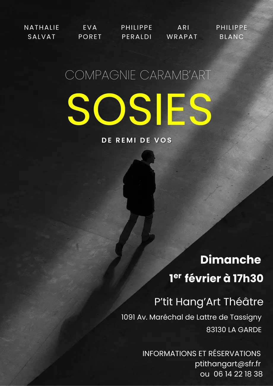 Succès festival d'Avignon 2025, la pièce SOSIES de Rémi De Vos par la Compagnie Caramb'art au P’tit Hang'Art Théâtre de La Garde le dimanche 1er février à 17h30.