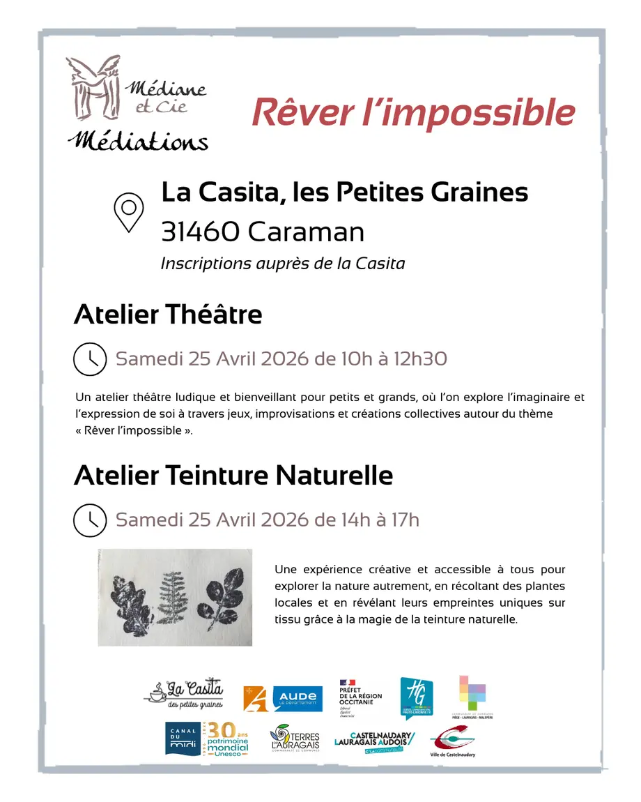 Atelier Théâtre "Rêvons L'Impossible"Le 25/04/2026CaramanNous proposons de répondre à la curiosité des participant·e·s et de les initier à la pratique théâtrale, d’offrir un espace d’expression où […]