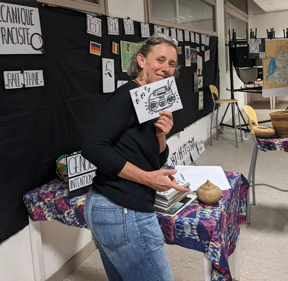 J’y mets en scène mon expérience (des savoirs chauds), j’apporte des éclairages sur l’histoire (les savoirs froids), j’alerte sur la construction du racisme, j’interpelle sur le rôle des médias, je questionne les implications et les intérêts de la France au Rwanda, je raconte la place d’une jeune coopérante technique dans un pays sous tension, le tout en montrant le déroulé de la mécanique raciste sur une frise chronologique de la fin du XIXe siècle au 6 avril 1994.