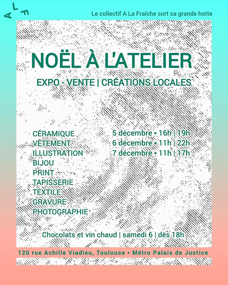 Le collectif d'artistes et d'artisan.e.s "A La Fraîche" sort sa grande hotte et vous invite à son petit marché de Noël avec une expo-vente au cœur d'un atelier chaleureux situé à deux pas du Palais de Justice.