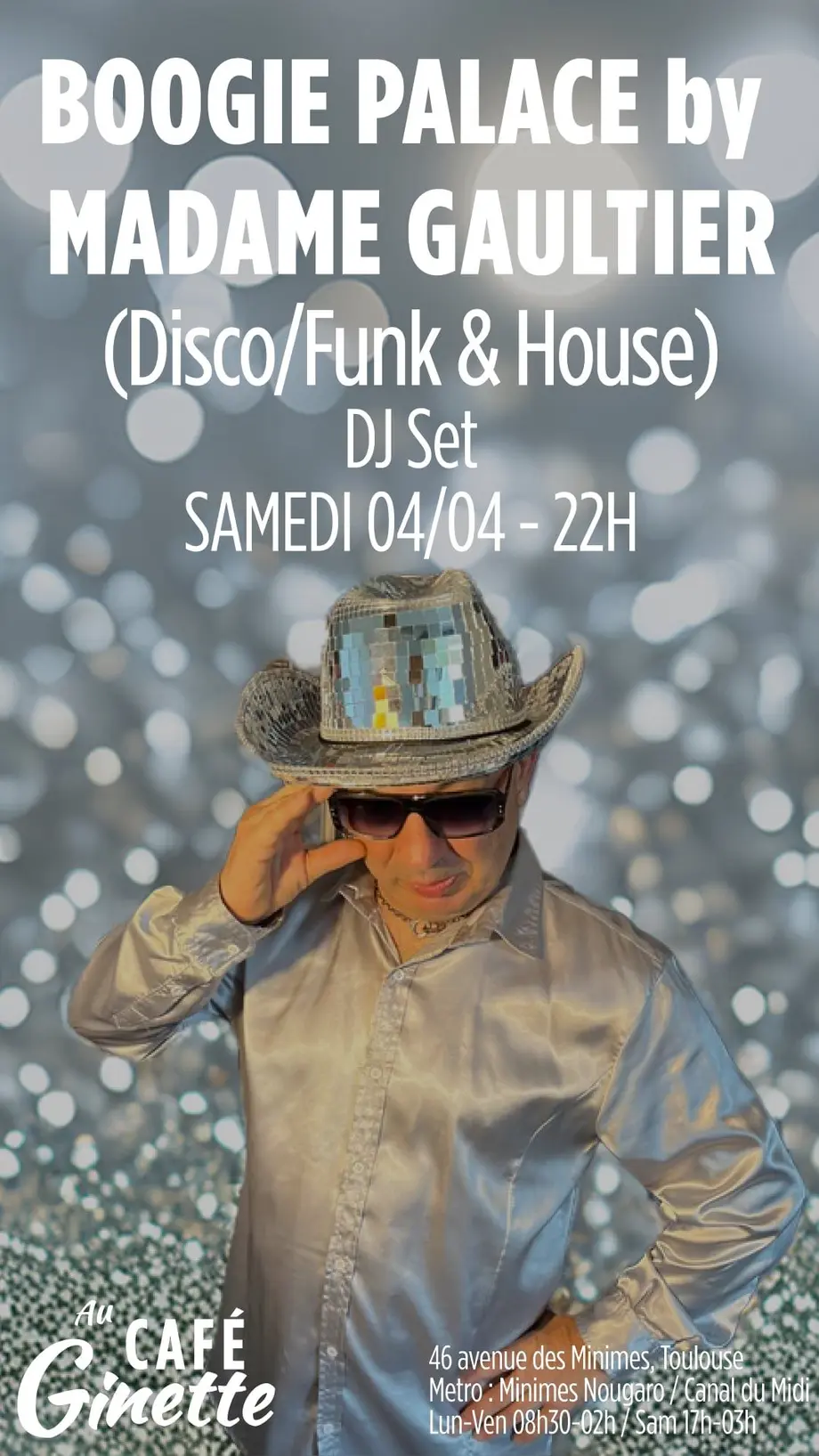 Boogie Palace by Madame Gaultier vous ouvre ses portes pour une nuit flamboyante où le disco incandescent rencontre le funk irrésistible et la house élégante.