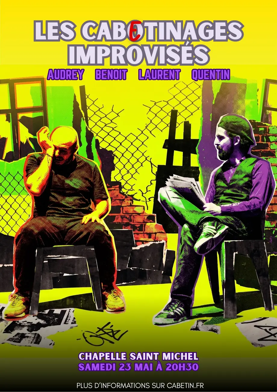 Retrouvez les Cabetin le samedi 23 mai à la salle Saint Michel pour Les Cabetinages Improvisés ! Sans script ni filet, tout se crée sous vos yeux. Nos comédiens tissent des histoires uniques, drôles et éphémères. Une soirée où l'inattendu est roi et où le public mène la danse.