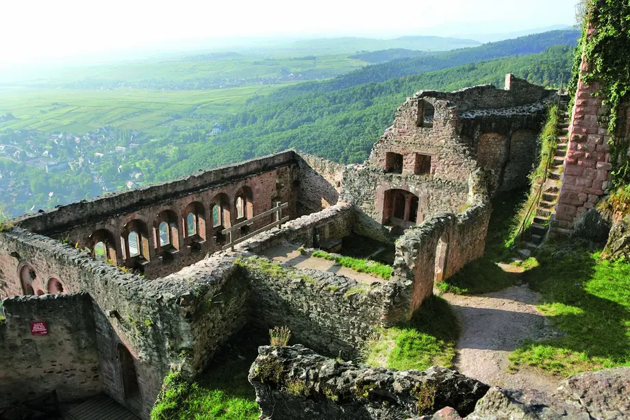 Le château de Saint-Ulrich fait partie des trois châteaux de Ribeauvillé. Appartenant à la famille des Ribeaupierre, il est l’un des châteaux les mieux conservés et le plus faste des 3. N’ayant pas eu de rôle défensif, il arbore une architecture excentrique, mélangeant les styles architecturaux : des parties sont romanes et d’autres ajouts d’éléments sont de style gothiques, voire Renaissance. Les ruines actuelles nous donnent une idée de ce à quoi pouvait ressembler cette vaste résidence tout en grès des Vosges : son donjon, ses délicates enfilades de fenêtres sculptées et ses dimensions hors normes ! La cerise sur le gâteau, c’est bien sûr sa vue imprenable sur la plaine d’Alsace et le typique village de Ribeauvillé en contrebas.