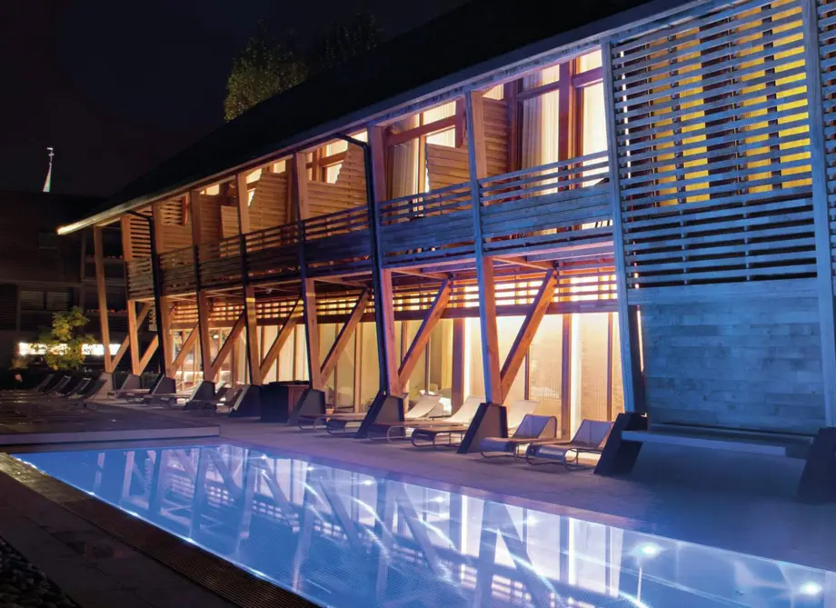 C'est au bord du Rhin, en Suisse, que le complexe thermal de Sole Uno est installé. Un lieu à l'architecture contemporaine et moderniste en béton brut. Pour profiter pleinement de cette expérience, plongez directement dans les bains chauds d'eau saline à l'intérieur et à l'extérieur, en alternant les expériences aquatiques comme les jets massants et les courants d'eau.