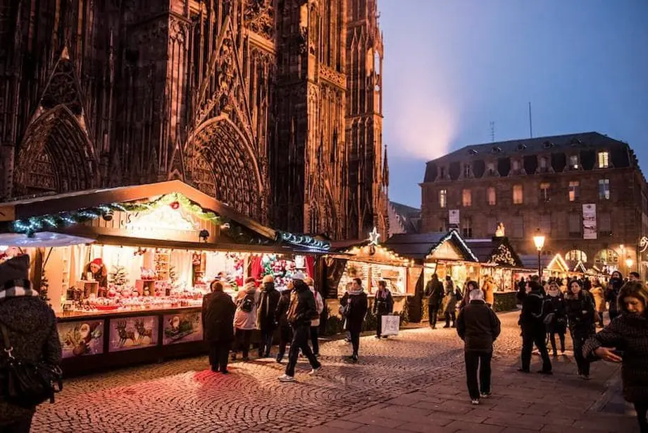 Place "Breuil", comme disent les strasbourgeois, c'est le typique Christkindelsmärik, l'un des plus anciens marchés de Noël au monde. Parmi les chalets, vous pourrez trouver des décorations de Noël, du vin chaud, des baguettes flambées, des crêpes et un stand de vente de sapins de Noël locaux devant l'Opéra du Rhin. Une étape à ne surtout pas rater ! Une fois que vous aurez fait le tour, descendez vers la rue du Dôme pour arriver au marché de la Cathédrale ou passez par la rue des Hallebardes pour admirer les magnifiques lustres de cristal Baccarat suspendus.