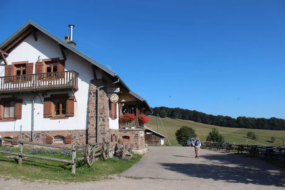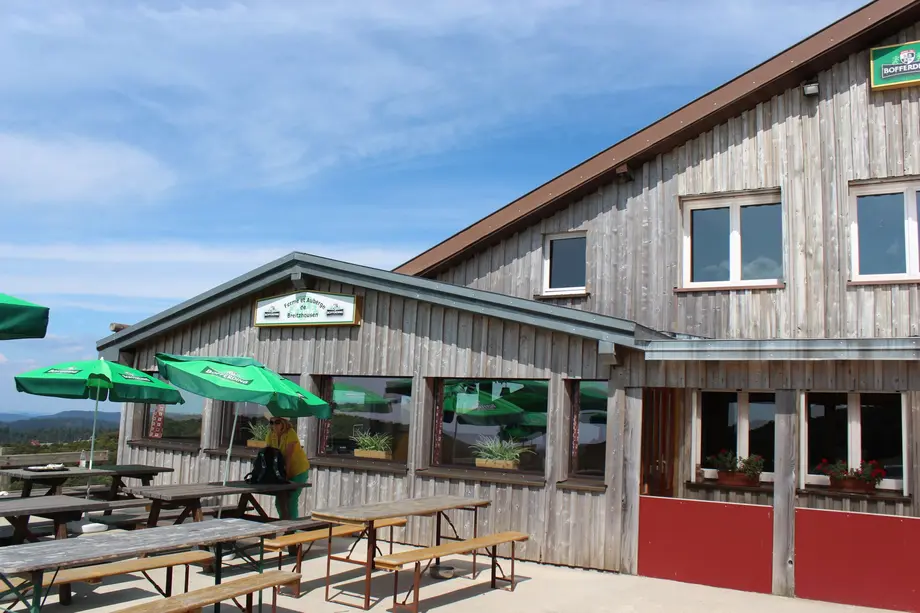 Bonne ambiance à la ferme auberge du Breitzhousen ! Le long de la route des Crêtes, cette grande ferme accueille les randonneurs pour y boire un verre en terrasse, ou y manger des plats traditionnels. La grande terrasse offre une vue sympathique sur les monts environnants le lac de la Lande.