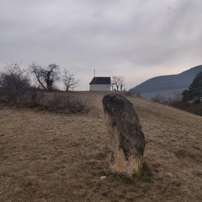 Avec un étrange menhir au premier plan, découvrez la chapelle du Bollenberg qui domine le village d'Orschwihr. La toute petite chapelle est dédiée à Sainte Appolonia, sainte patronne des dentistes, sensée éviter tout rassemblement de sorcières.
