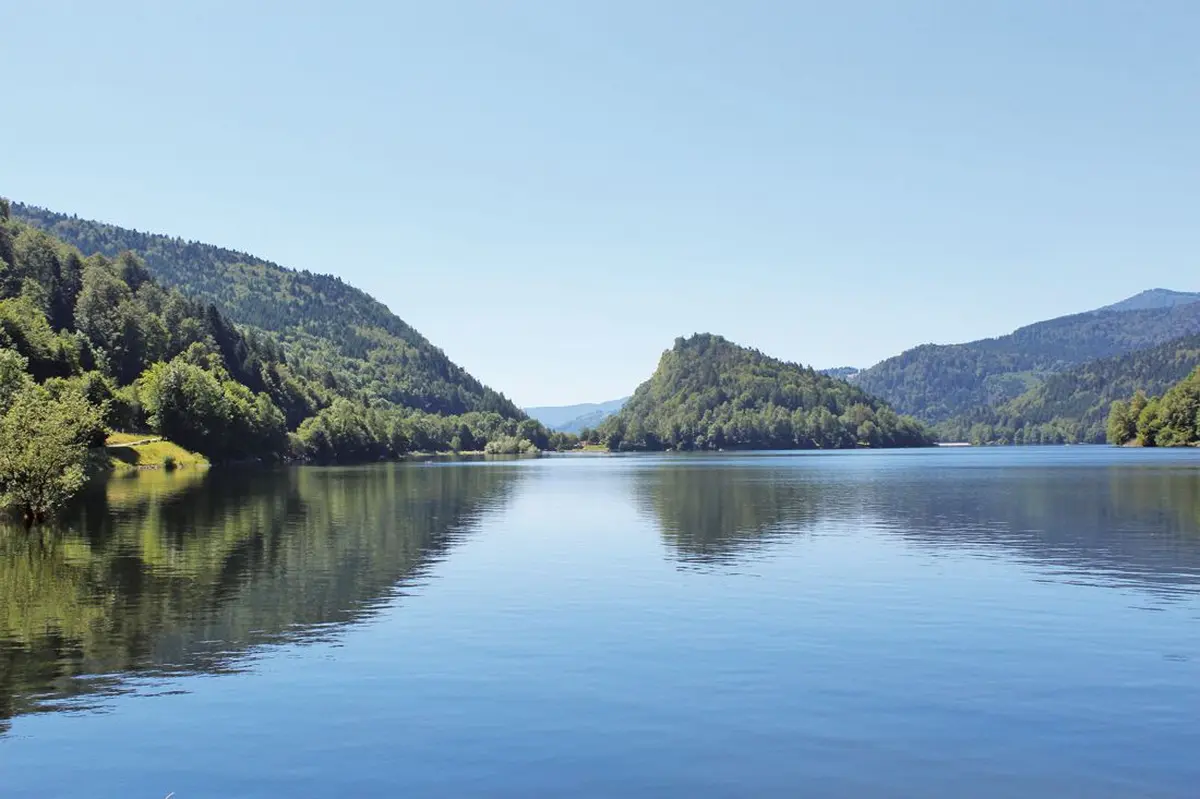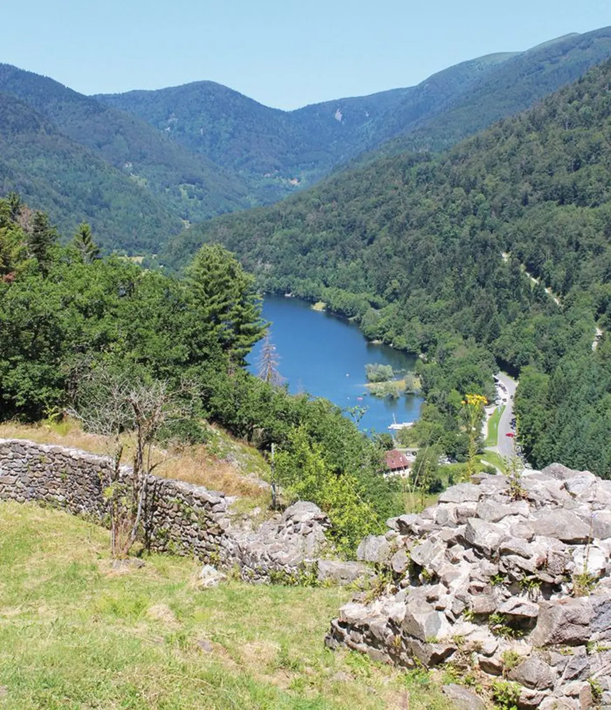 En grimpant au sommet du Schlossberg, à 670 mètres, on accède aux ruines du château de Wildenstein, détruit en 1644, qui dominait la vallée de Saint-Amarin. Vue superbe sur le lac en contrebas.