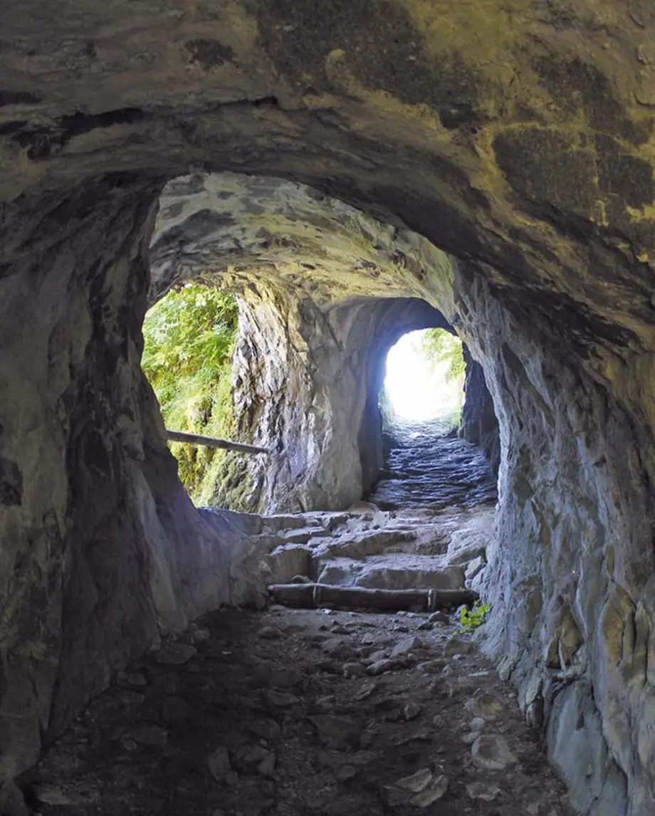 Pour accéder aux ruines il faut passer par un sentier découverte qui grimpe à pic et qui vous fait traverser un tunnel d’accès - ou grotte - qui vaut le coup d’oeil.