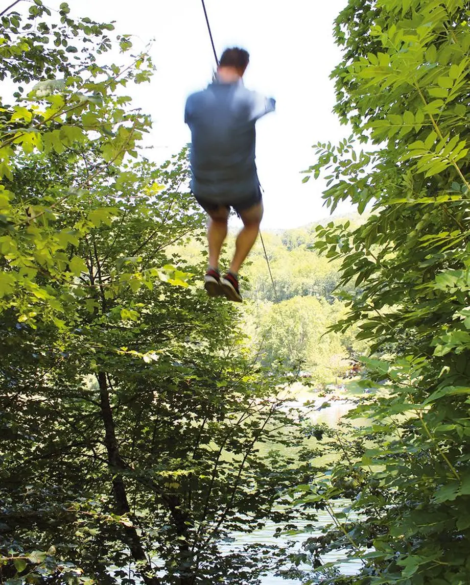 La grande tyrolienne qui vous fait passer au-dessus du lac reste l’un des « classiques » à faire sur place.