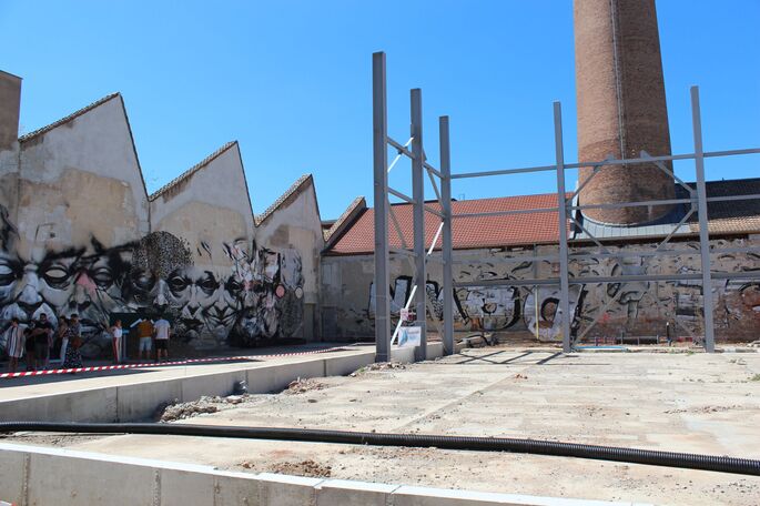 Juste à coté de Motoco, un bâtiment à ciel ouvert accueille déjà d'importantes fondations en acier : le chantier du Climbing Mulhouse Center (CMC) a déjà commencé. La charpente va mesurer près de 26 mètres de haut une fois montée. Le long de la cheminée de l'ancienne blanchisserie, le mur d'escalade et son espace urbain prend doucement forme.