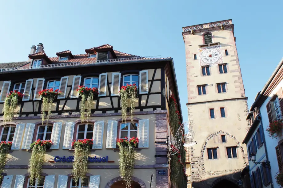 Au XIIIe siècle, Ribeauvillé s’entoure de remparts et se divise en quatre quartiers. Pour passer de l’un à l’autre, des tours-portes sont érigées comme la tour des bouchers, appelée ainsi en raison des commerces qui s’étaient installés à ses pieds. Elle a été construite en 1290 pour séparer la ville moyenne de la vieille ville. Elle a été rehaussée en 1536 et culmine à 29m aujourd’hui. Elle a servi de beffroi et de prison.