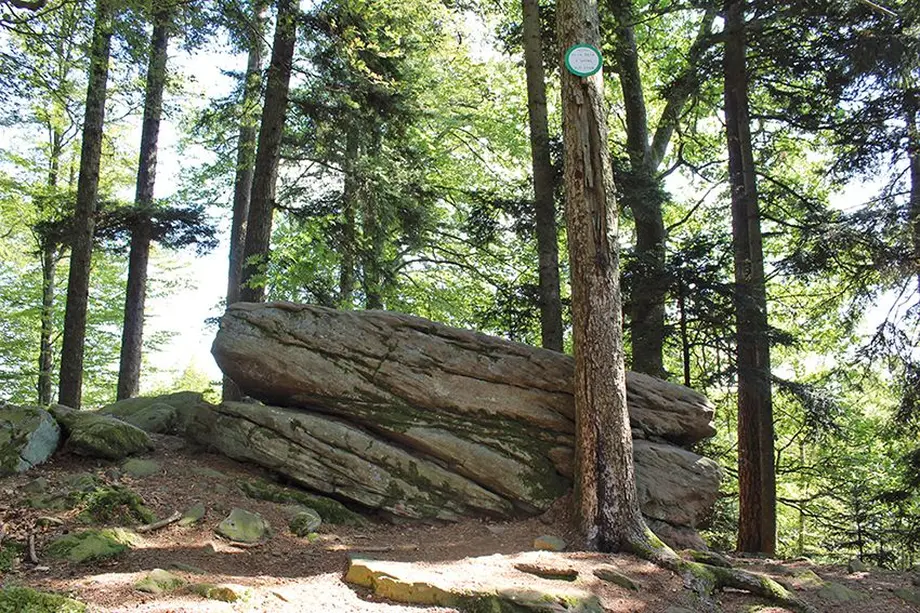 Le premier rocher rencontré en chemin n’a rien d’énigmatique : il est un témoin historique. Le 17 octobre 1797, le traité de Campoformio, dans le canton d’Udine, dans le nord de l’Italie met fin à la guerre entre la France et l’Autriche, remportée par Napoléon Bonaparte. Pour l’occasion, les habitants de Ribeauvillé gravèrent une inscription à la paix d’Udine sur ce qui ressemble à un autel de la patrie.