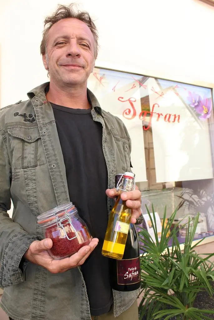 Hervé Barbisan et ses déclinaisons de produits au safran, devant sa boutique de Saint-Hippolyte
