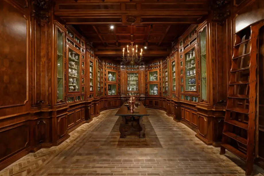 Une salle antique luxueuse, chaleureusement éclairée, avec des armoires en bois exposant de la porcelaine fine, une table centrale, des sols en briques et un lustre.