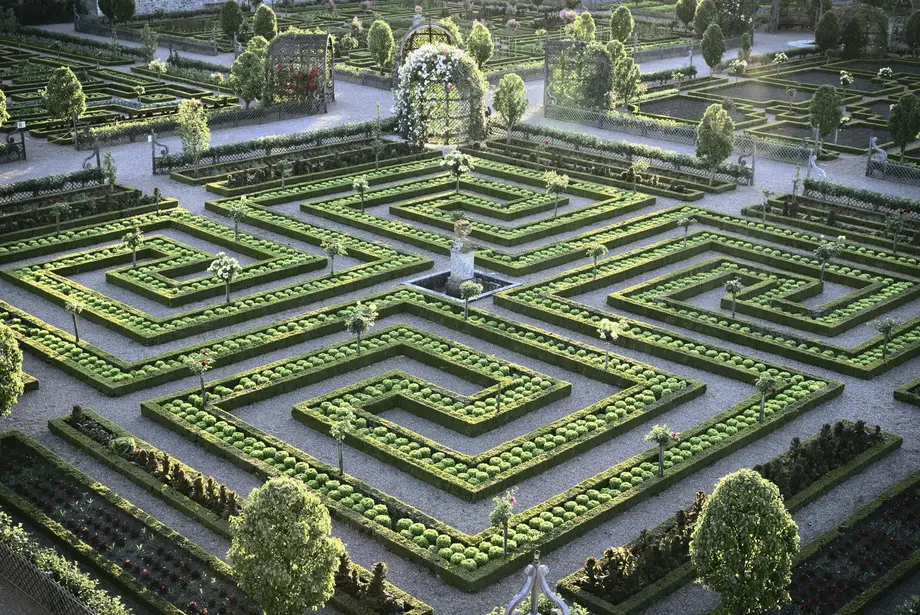 Labyrinthe de jardins complexes avec des haies entretenues, des allées, des statues et des arches ornées de fleurs et de verdure.