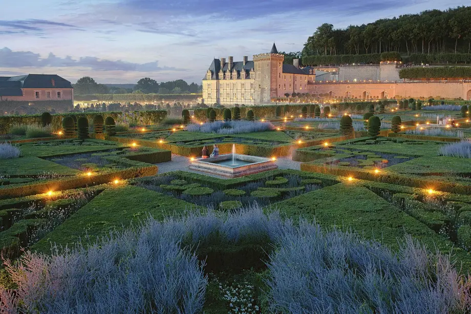 Jardin formel avec des haies géométriques et des allées éclairées devant un château historique au crépuscule. Deux personnes sont assises près d'une fontaine centrale.
