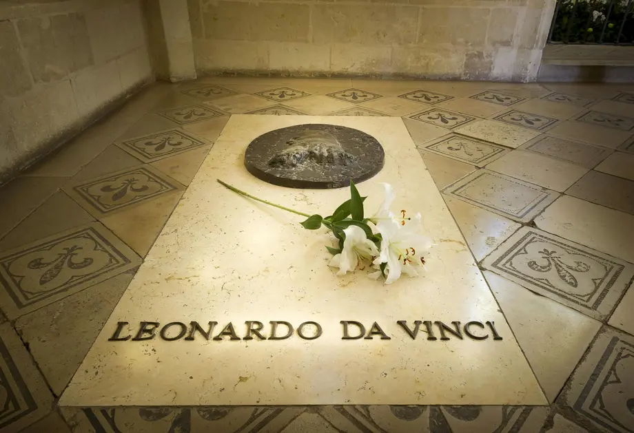 Une fleur posée sur une dalle de pierre portant l'inscription "Leonardo da Vinci" sur un sol carrelé.