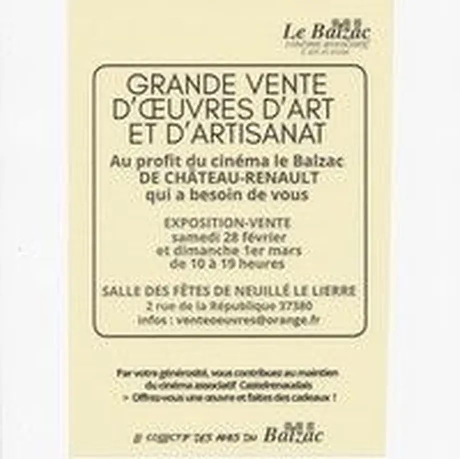 Grande vente d'oeuvres d'art et d'artisanat au profit du Cinéma LE BALZAC de CHATEAU-RENAULT qui a besoin de vous.