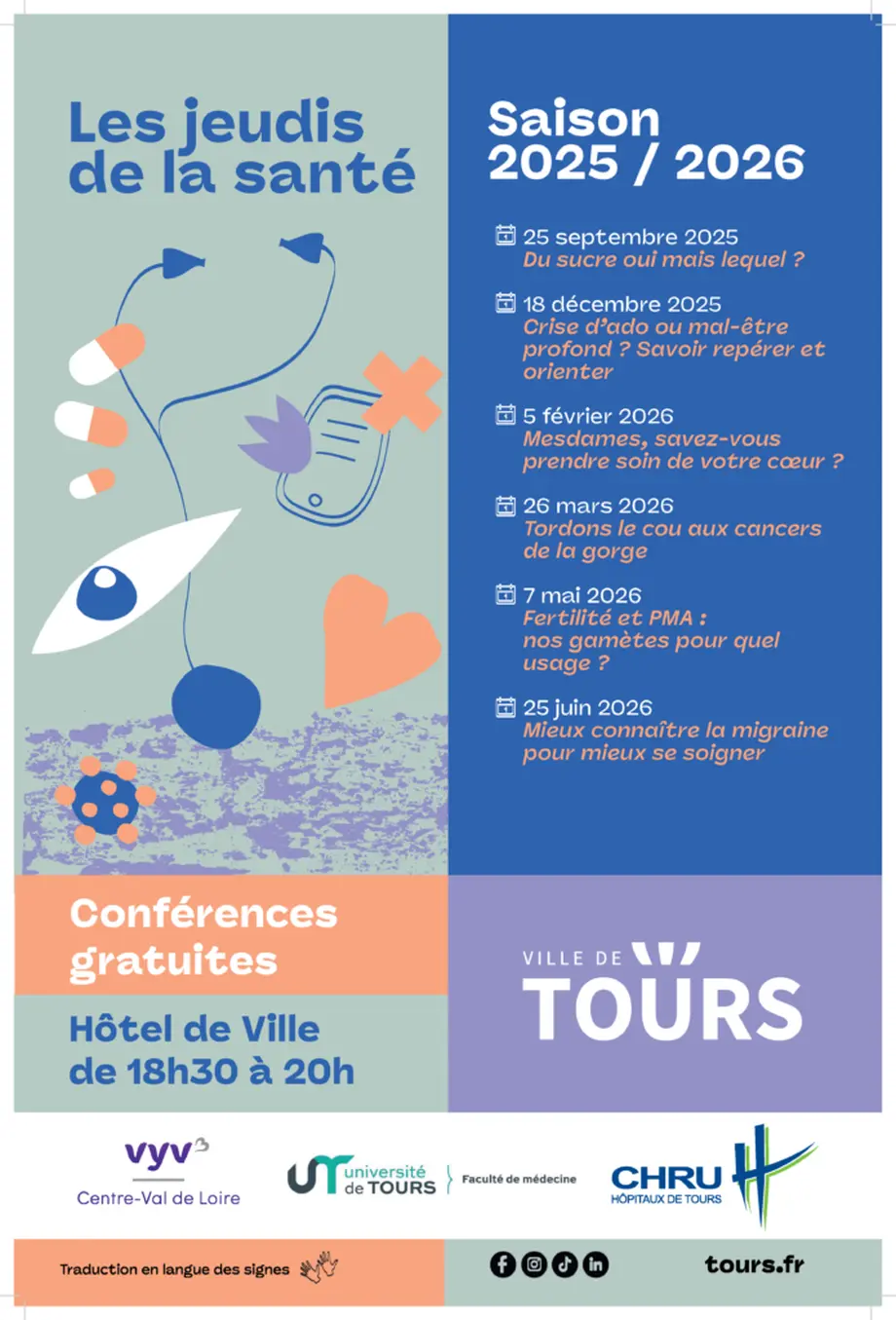 La Ville de Tours, les médecins du CHRU, l'Université de Tours et la Mutualité Française Centre Val de Loire proposent leur nouveau cycle de conférences, dans le cadre des Jeudis de la Santé.