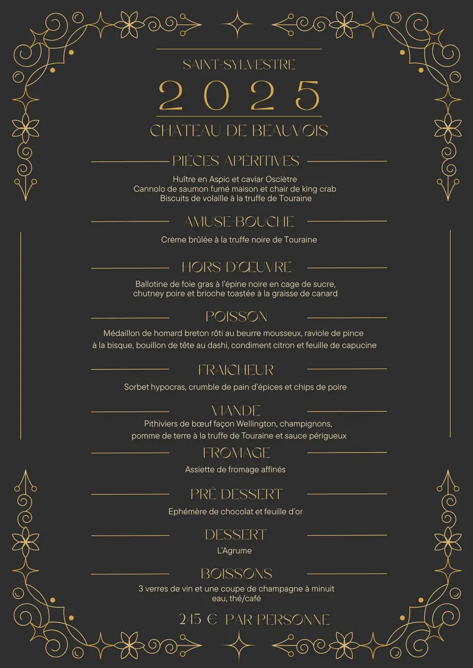 Le Château de Beauvois**** vous propose un séjour pour la Saint-Sylvestre royal, avec un dîner gastronomique en huit temps conçu par notre nouveau chef Teddy RAGAIN, incluant une coupe de Vouvray pour l’apéritif, un accord de deux verres de vin, la coupe de champagne pour les douze coups de minuit, l’eau et le café, suivi d’une soirée dansante et d’une nuitée dans l’une de nos chambres majestueuses.
