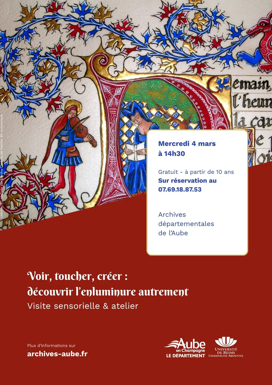 Dans le cadre d’un projet professionnel mené avec l’Université de Reims Champagne-Ardenne – Campus des Comtes de Champagne – à Troyes, le Département de l’Aube propose une immersion sensible et créative au cœur de l’art de l’enluminure, aux Archives départementales de l’Aube.