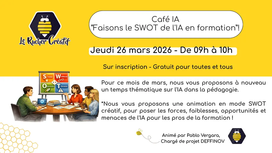 Nous vous proposons une animation en mode SWOT créatif pour poser les forces, faiblesses, opportunités et menaces de l’IA pour les pros de la formation !