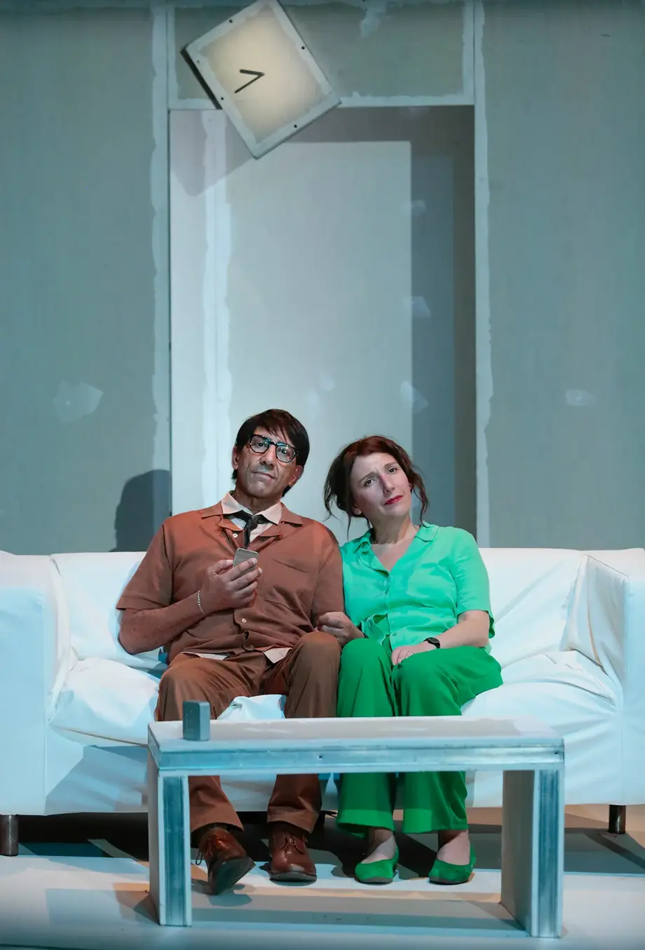 Cette absence de décor évoque la disparition du fils de la famille et désigne l’entrée du couloir menant à sa chambre, où le jeune garçon est prostré et vers laquelle tous les personnages vont concentrer leurs efforts. Car la vie millimétrée de cette famille débordée, embarquée dans la grande lessiveuse du quotidien, vole en éclats lorsqu’une faille temporelle fait irruption : une heure a disparu de leur existence, une heure manque au cadran de l’horloge.