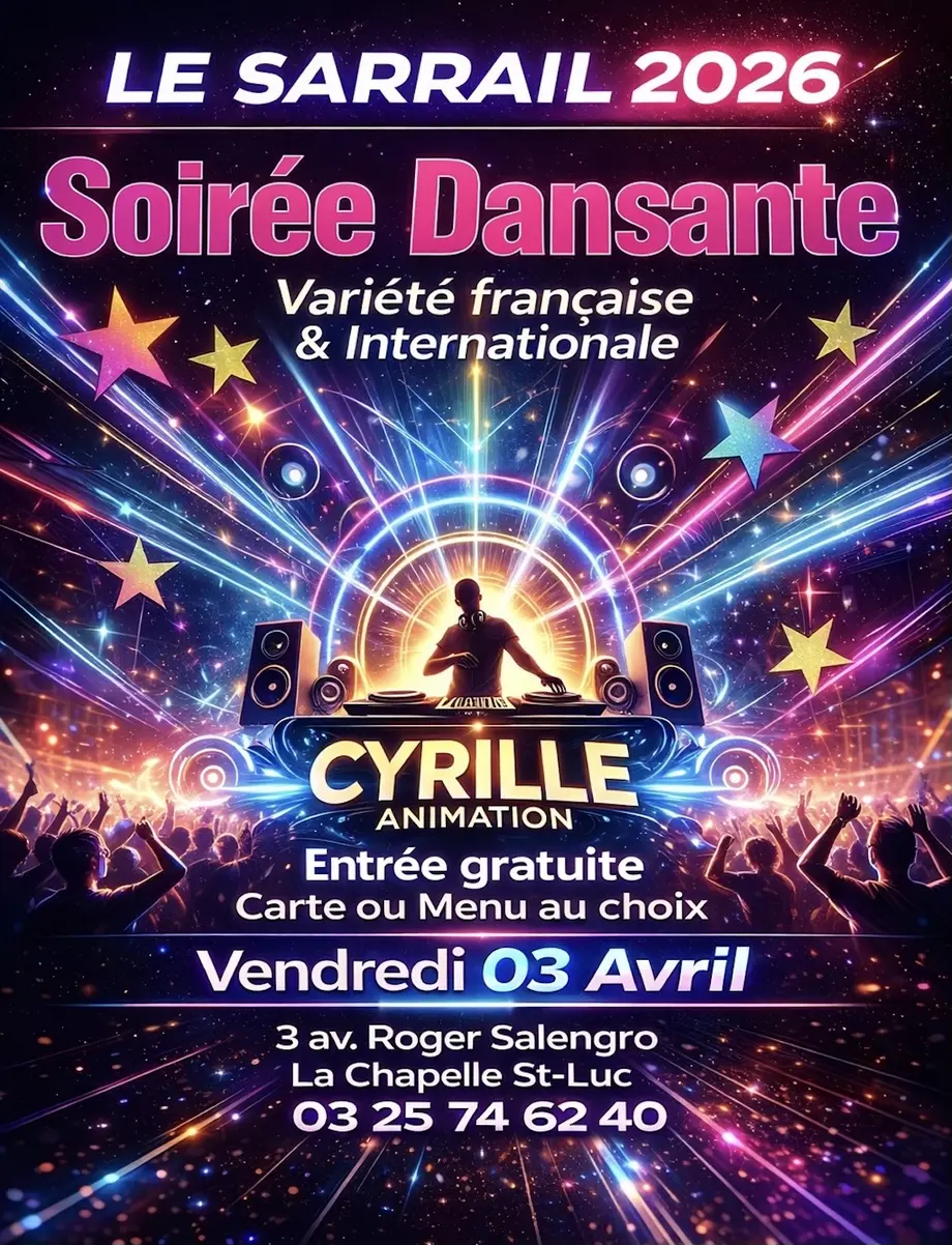 Soirée dansante avec Mika aux platinesLe 16/05/2026La Chapelle-Saint-LucTarif de la soirée :. Entrée gratuite ; repas sur place. Toute la carte et les menus seront disponibles.