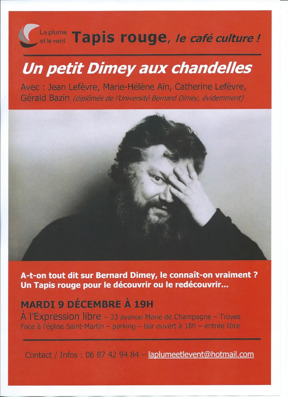 A-t-on tout dit sur Bernard Dimey, le connaît-on vraiment ? Ce Tapis rouge sera l’occasion de le découvrir ou de le redécouvrir, à travers son histoire et ses écrits qui sentent la vie, la vraie, celle qui déborde, la mort, l’espoir, le désespoir et aussi l’amour.