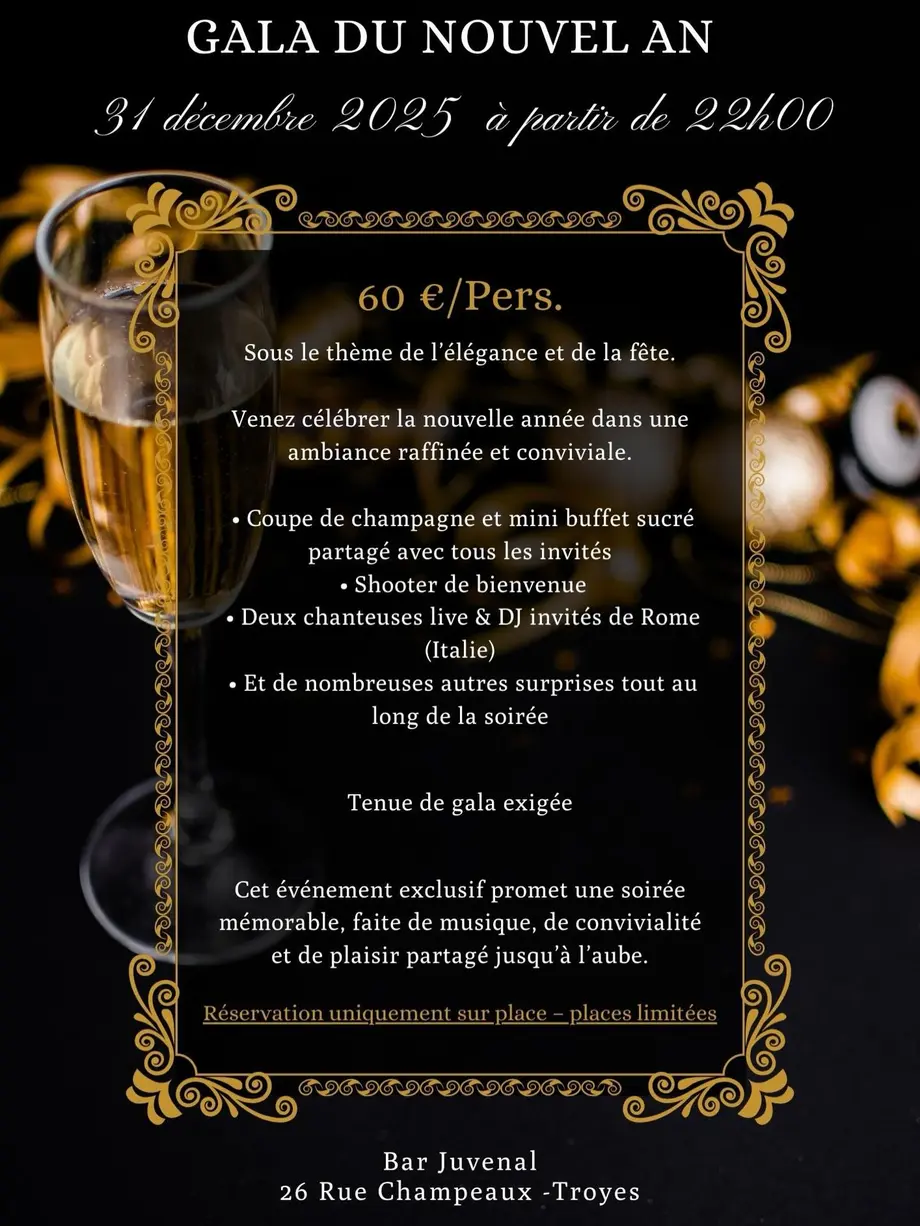 Soirée du Nouvel An à Romilly-sur-SeineLe 31/12/2025 Romilly-sur-SeineFêtez la soirée du Nouvel An à l'espace Culturel François Mitterrand ! Au programme : Un dress code chic !!
