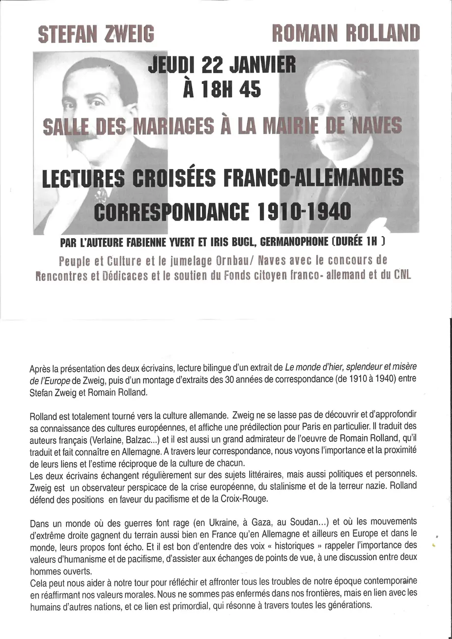 Après la présentation des deux écrivains, lecture bilingue d’un extrait de Le Monde d’hier, splendeur et misère de l’Europe de Zweig, puis d’un montage d’extraits des trente années de correspondance (1910-1940) entre Stefan Zweig et Romain Rolland.