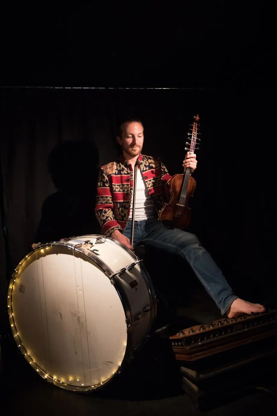 Seul en scène, entouré d’objets sonores improbables (chevalrouet, masques grelots, derviche tourne-disque) Frédéric Jouhannet, alias Rédèr Nouhaj, s’affranchit des codes pour exprimer une musique créative, vivante et insolite. À ses pieds : grosse caisse de fanfare, malle de voyage et pédalier d’accordéon basse accompagnent le mélodiste sans frontière ; mais ses violes et violons restent ses plus fidèles compagnons de route. Un musicien à la créativité folle, un véritable one-violin band !