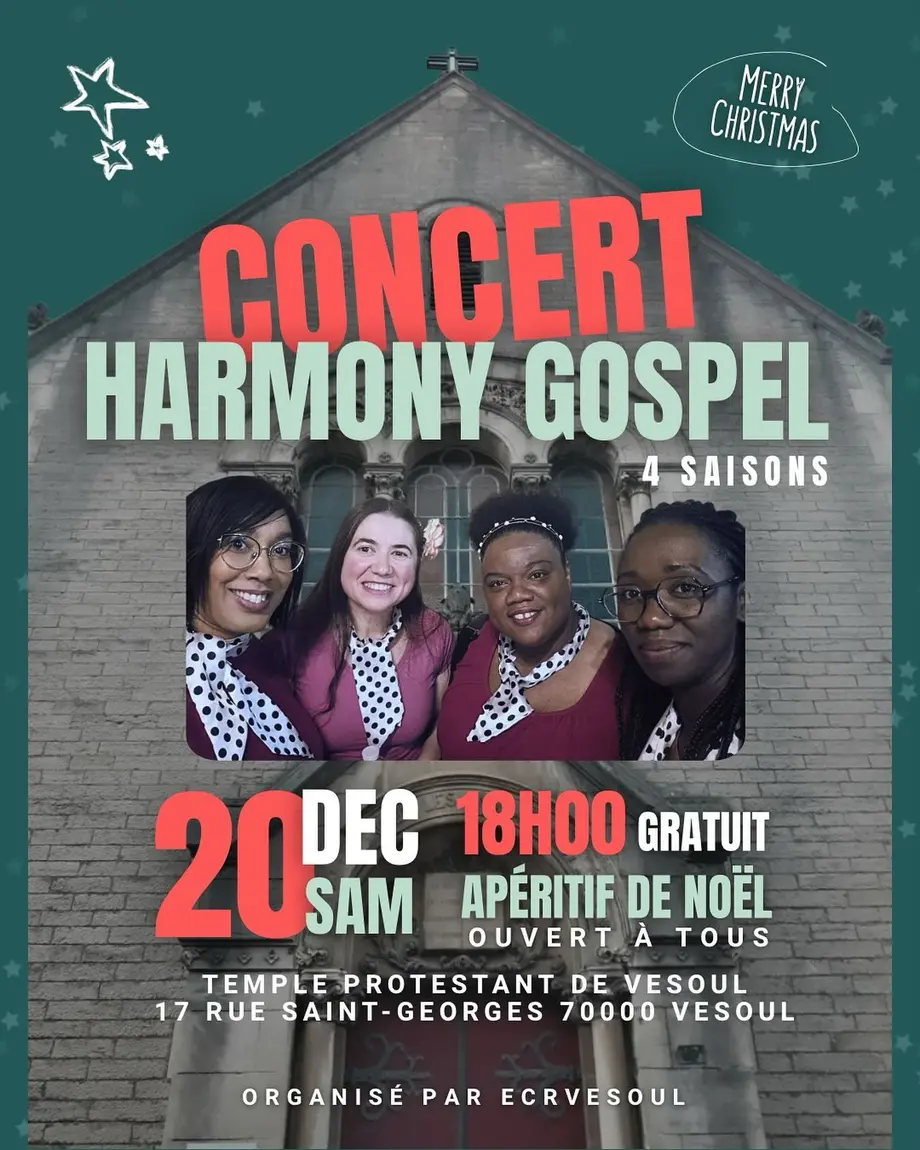 Nous vous invitons à partager un moment chaleureux et musical lors du concert Harmony Gospel. Une belle occasion de s’imprégner de l’ambiance de fin d'année à travers des chants empreints d’espoir, de joie et de lumière. un apéritif de Noël ouvert à tous sera offert à l’issue du concert afin de prolonger la rencontre dans un esprit convivial.